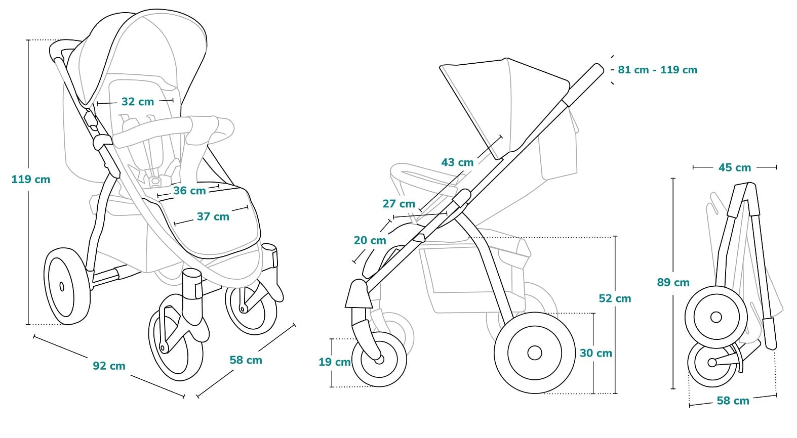 • wózek rozłożony: 58cm x 92cm x 119 cm